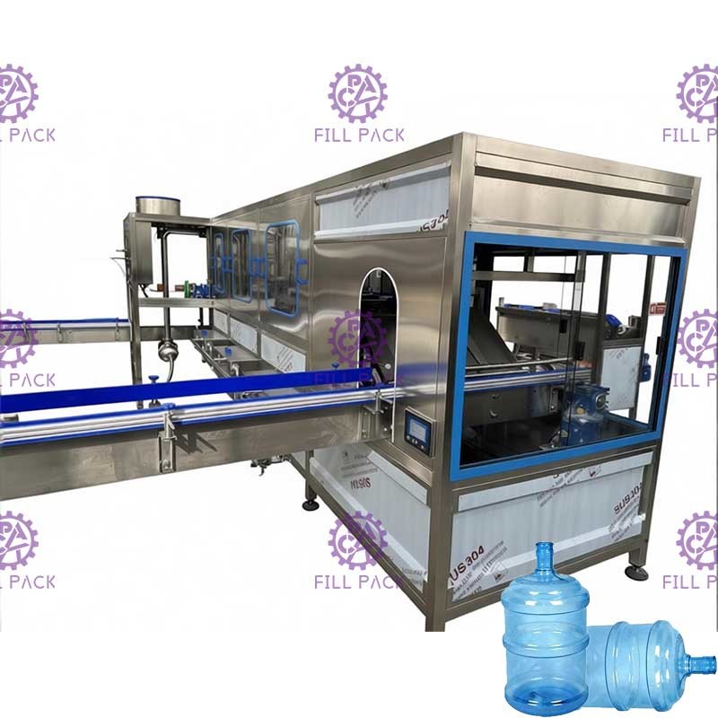 Η όλη γραμμή πλήρωσης 5 Gallon περιλαμβάνει Αυτόματο De-capper, Περιστροφικό εξωτερικό πλυντήριο, Πλυντήριο/Γεμιστικό/Καπακωτικό τύπου L, Μηχανή συρρίκνωσης θερμότητας, Έλεγχος φωτός