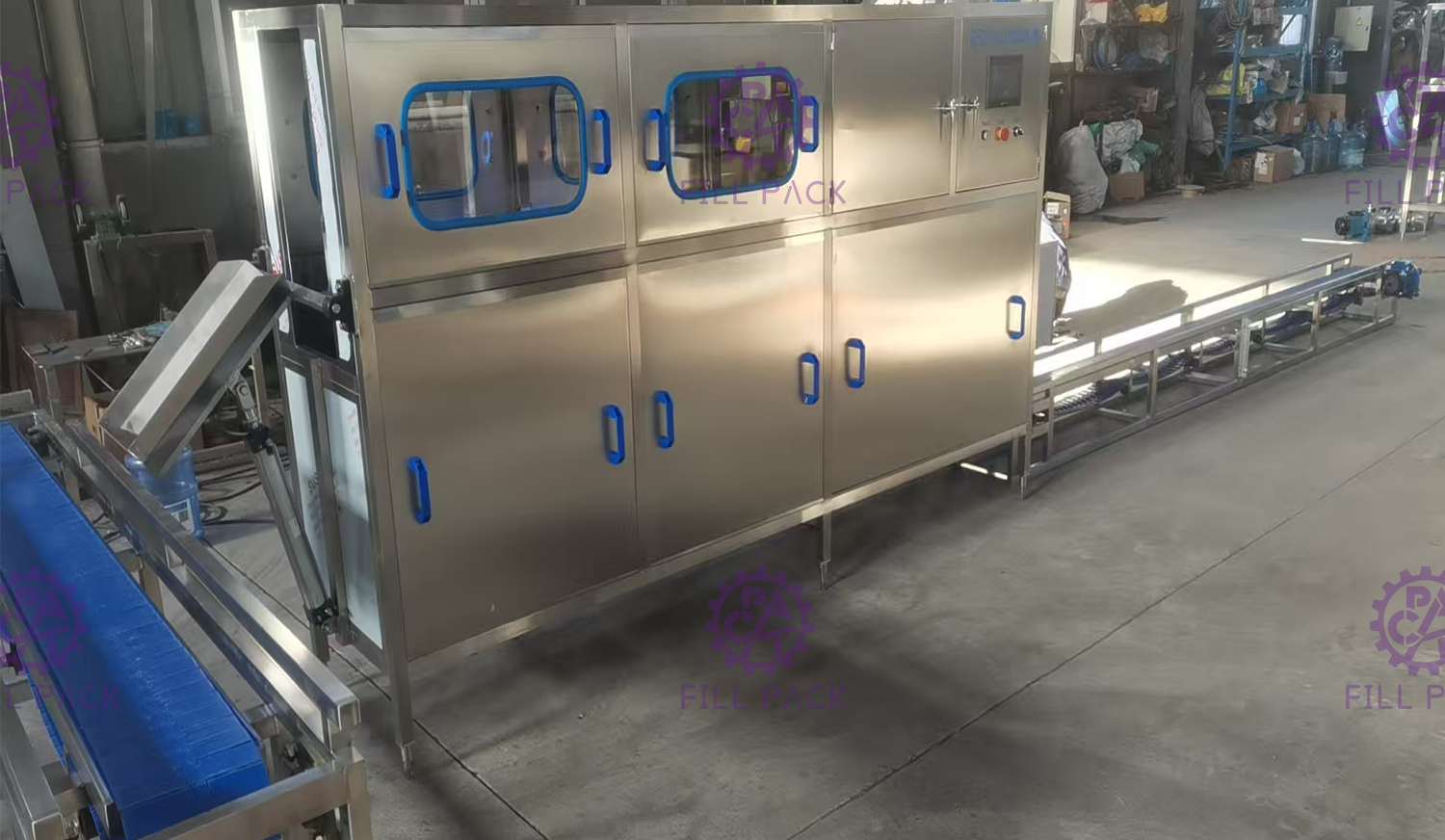 Ολόκληρη η γεμίζοντας γραμμή νερού κάδων περιλαμβάνει ημι-αυτόματο de-capper και το πλυντήριο, rinser-υλικό πληρώσεως-capper Monoblock, μεταφορέας κυλίνδρων, ετικέτα συρρικνώνεται τη σήραγγα, ελέγχοντας την ελαφριά, στερεά μηχανή κωδικοποίησης ρόλων μελανιού
