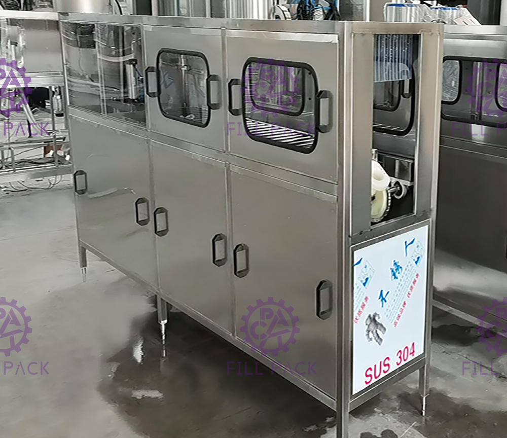 Το πλύσιμο θα χωριστεί σε 3 μέρη, η 1η διαδικασία είναι με απολυμαντικό υγρό, η 2η διαδικασία είναι με πλύσιμο με ανακυκλωμένο νερό, η 3η διαδικασία είναι με καθαρό νερό. Μετά το πλύσιμο, τα βάζα θα πέσουν σε γωνιακή πλάκα από τον κάτοχο του βάζου με αλυσίδα μετάδοσης με τη δύναμη της βαρύτητας. Στη συνέχεια, τα βάζα θα ωθηθούν από τον κύλινδρο ώθησης κάτω από την κεφαλή πλήρωσης, τότε θα ξεκινήσει η πλήρωση. Ο όγκος πλήρωσης μπορεί να ελεγχθεί από τη ρύθμιση του χρόνου πλήρωσης. Τα γεμάτα βάζα θα ωθηθούν κάτω από την κεφαλή καπακώματος από άδεια βάζα στη συνέχεια. Ο εργάτης τοποθετεί πολλά ατακτοποίητα καπάκια στον φορτωτή καπακιών, ο φορτωτής καπακιών θα ταξινομήσει το καπάκι αυτόματα για να το φορτώσει κάτω στη ράγα καπακιών. Όταν τα γεμάτα μπουκάλια περνούν κάτω από την κεφαλή καπακώματος, το καπάκι θα πέσει στο λαιμό του βάζου, τότε ο κύλινδρος καπακώματος θα κάνει το καπάκωμα αυτόματα με τον κύλινδρο πίεσης καπακιού.