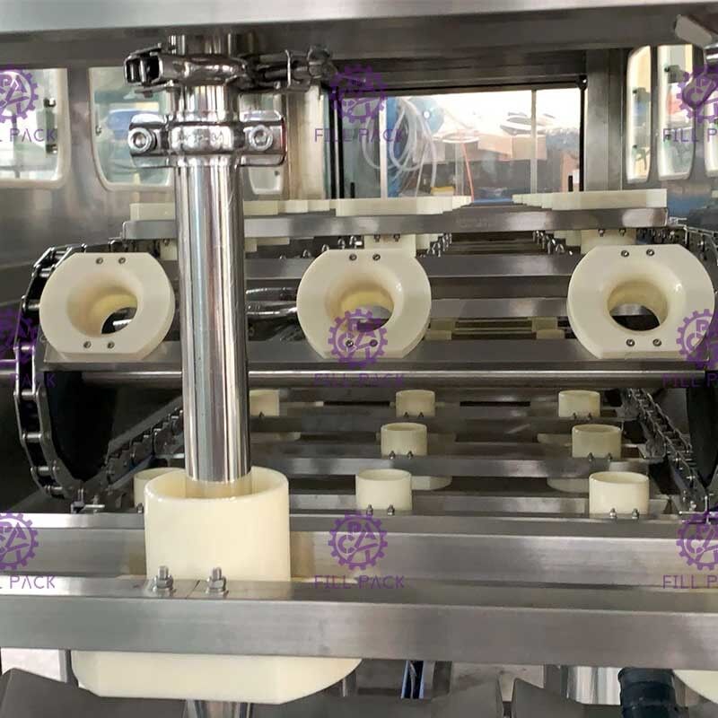2Μετά το ξεπλύσιμο, τα ξεπλυμένα κενά μπουκάλια μεταφέρονται από τον μηχανισμό κίνησης του πλύματος των μπουκαλιών και πέφτουν στο ράφι που σπρώχνει τα μπουκάλια.Το κύλινδρο σπρώξιμο μπουκάλι λειτουργεί για να σπρώξει τα άδεια μπουκάλια στην θέση πλήρωσης, έτσι ώστε ο πύργος πλήρωσης να ευθυγραμμίζεται με το στόμα του μπουκαλιού νερού κλπ. Αφού ξεπλυθεί το νερό, η αντλία πλήρωσης αρχίζει να γεμίζει. (Ο χρόνος πλήρωσης ρυθμίζεται από τον χρήστη σύμφωνα με τις ανάγκες)